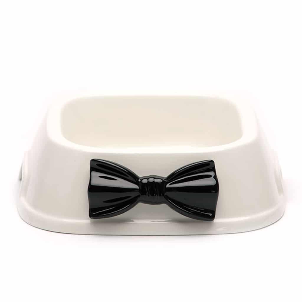 Ciotola per cani in ceramica bianca con applicazione papillon smaltato.