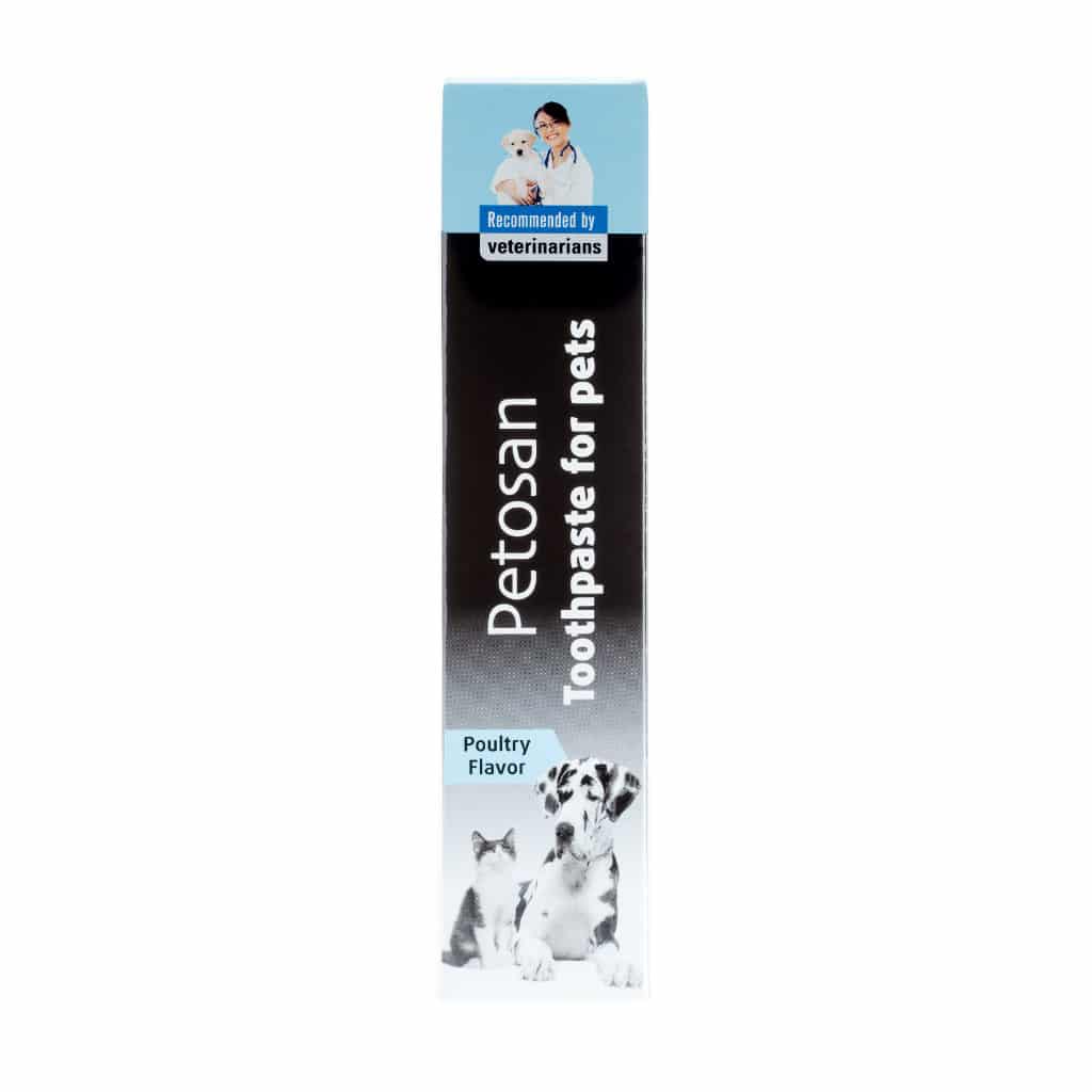 La pasta dentifricia Petosan, aromatizzata alla carne di pollo, è formulata per rimuovere la placca e combattere la formazione del tartaro sui denti del cane.