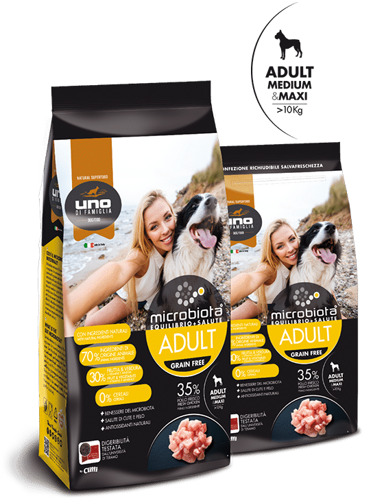 Il mangime per cani UNO DI FAMIGLIA ADULT MEDIUM – MAXI che ha il pollo fresco come primo ingrediente ed è senza cereali (grain free), è studiato per soddisfare le esigenze nutrizionali del cane adulto di taglia medio – grande.